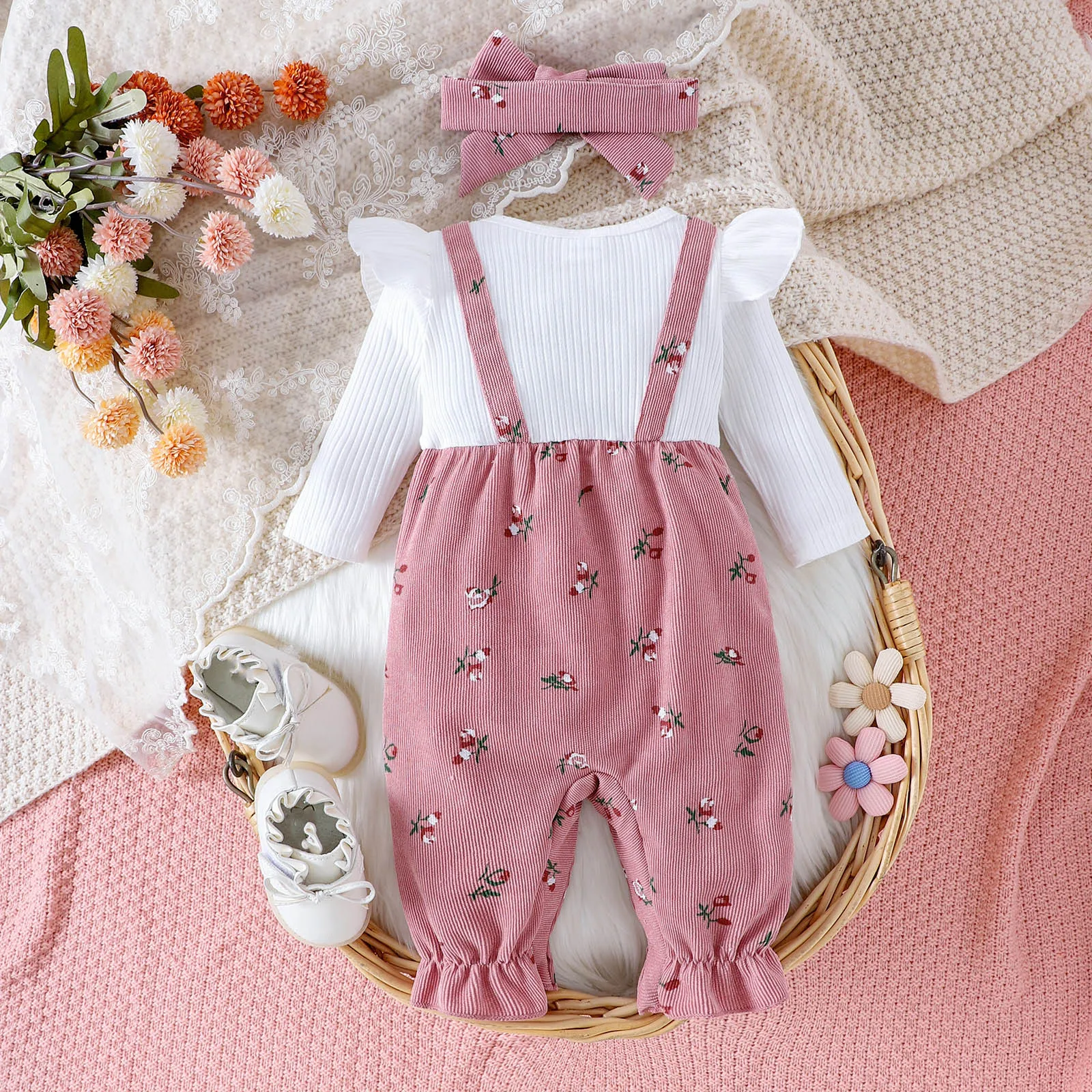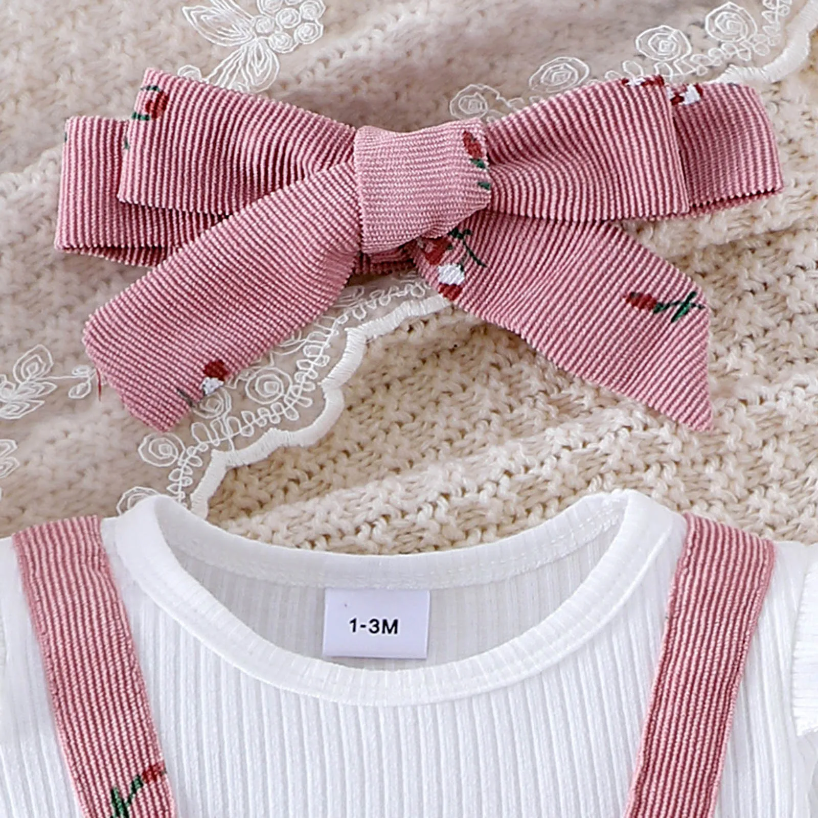 Floral Bow Overall Three Piece Set